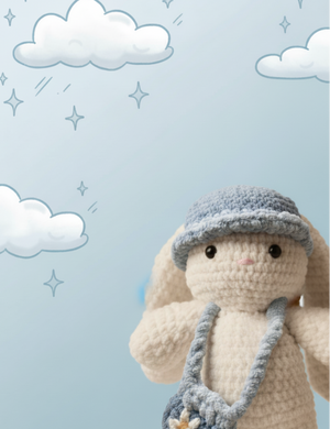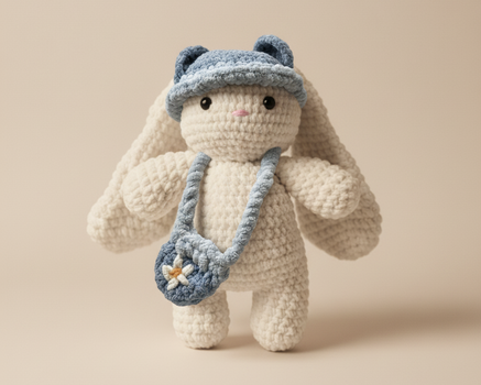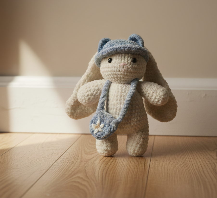 Bunny Boonie brings a warm spark of sweetness to any space. With its soft little hat and flower-accented bag, this fluffy bunny adds a gentle touch of handmade joy to every room. Whether perched on a shelf or carried in tiny hands, its fluffy, whimsical design inspires smiles, imagination, and heartwarming moments.