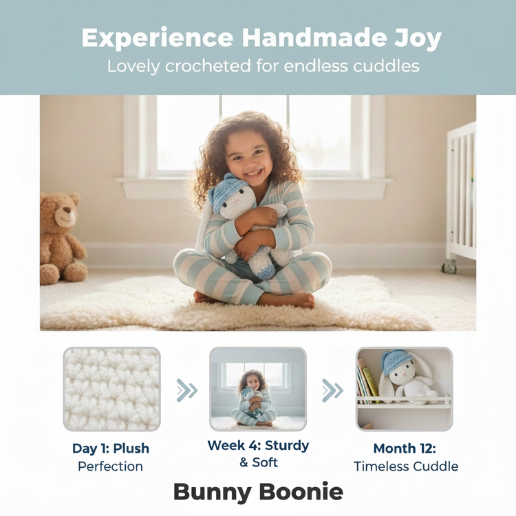 Lovingly crafted by hand from plush cotton yarn, Bunny Boonie offers an ultra-soft cuddle experience that stands up to everyday play. Each stitch ensures lasting durability, making this plushie a cozy companion for countless hugs and snuggles.